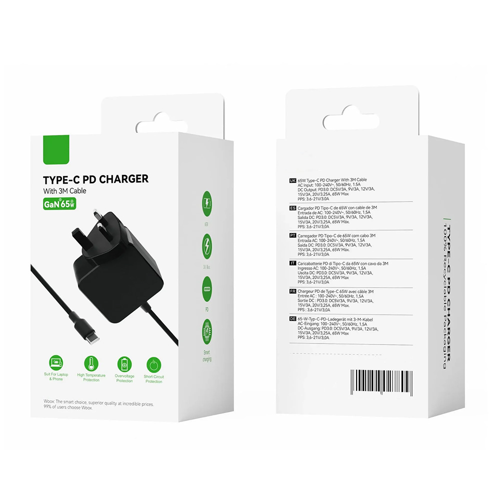 65W USB-C PD laptop charger with built-in USB-C cable. Works for laptops, MacBooks, Chromebooks, smartphones, tablets, and other devices that use a USB-C port to charge.